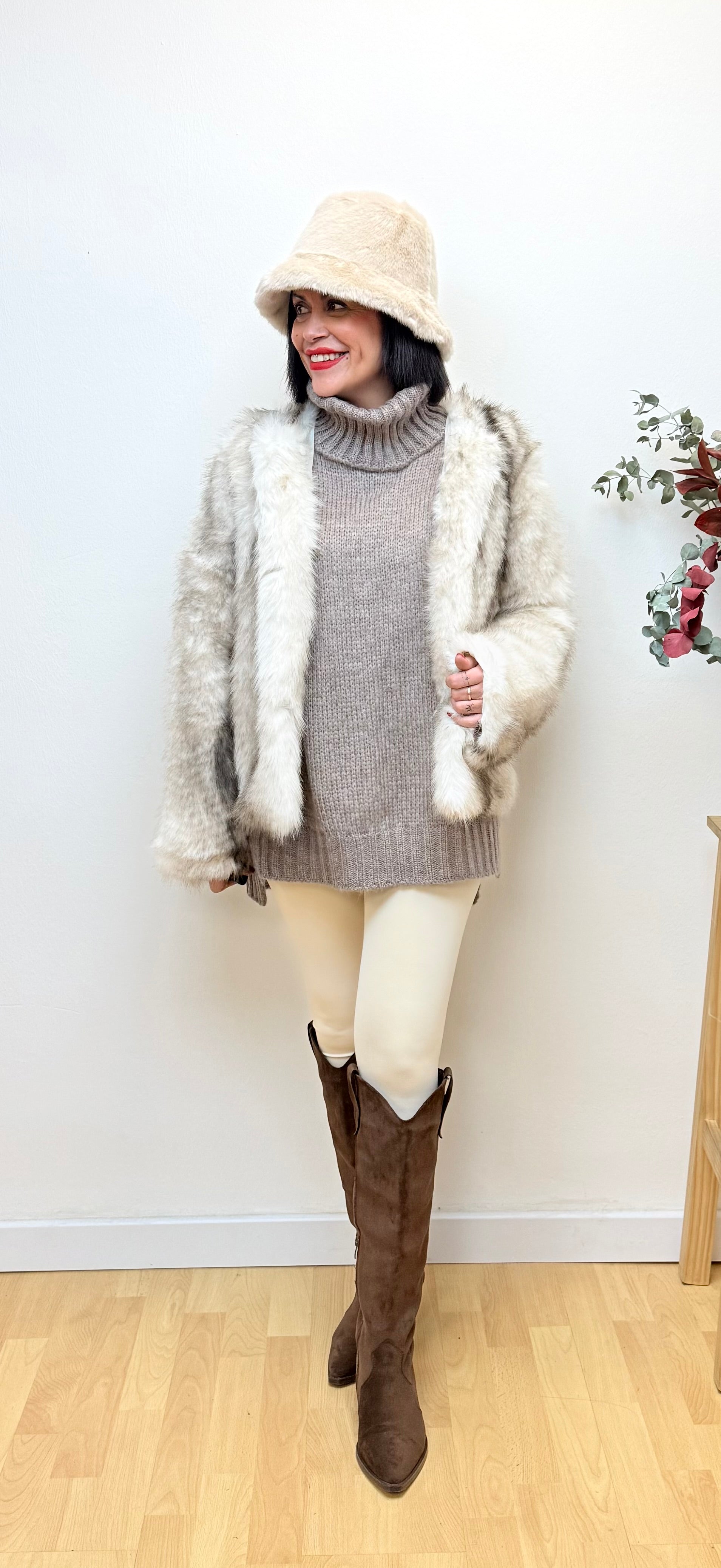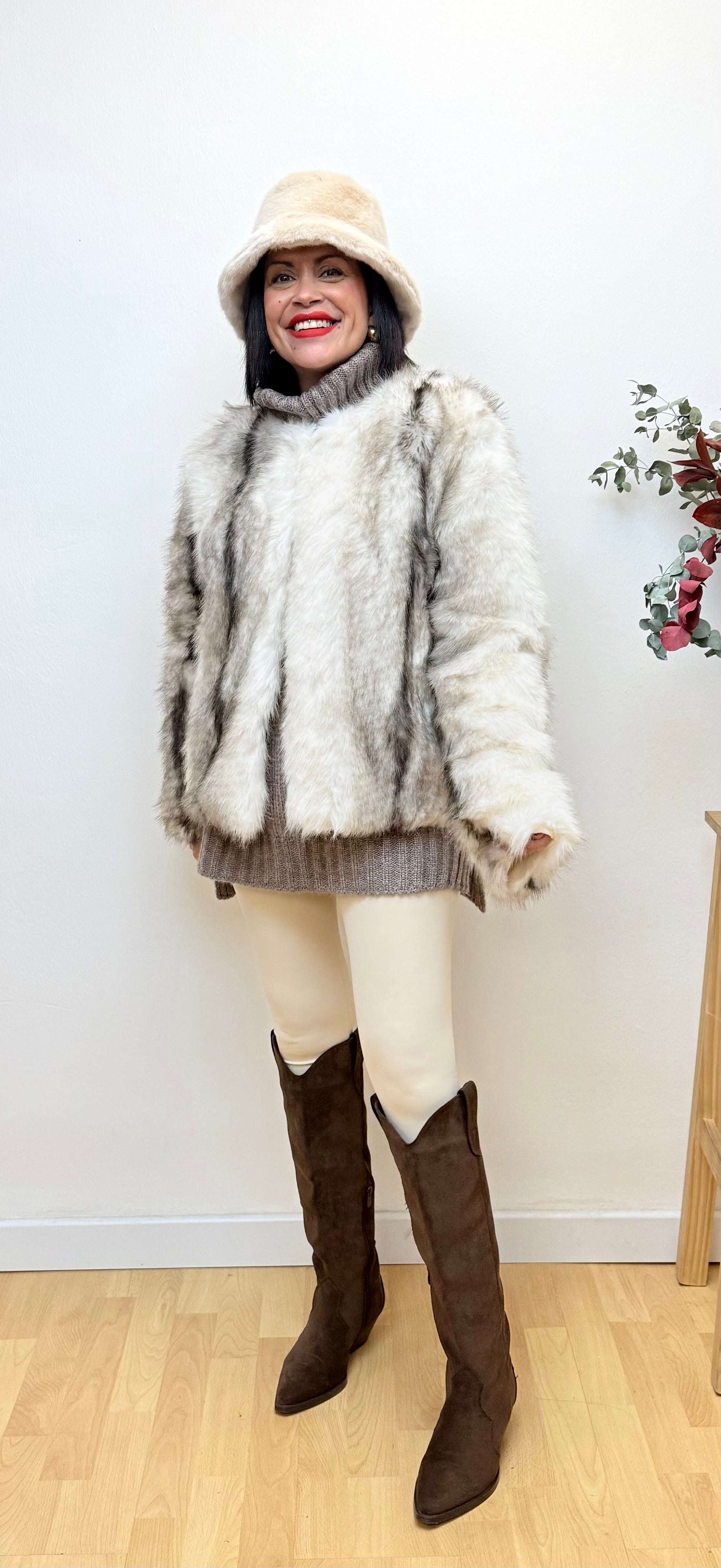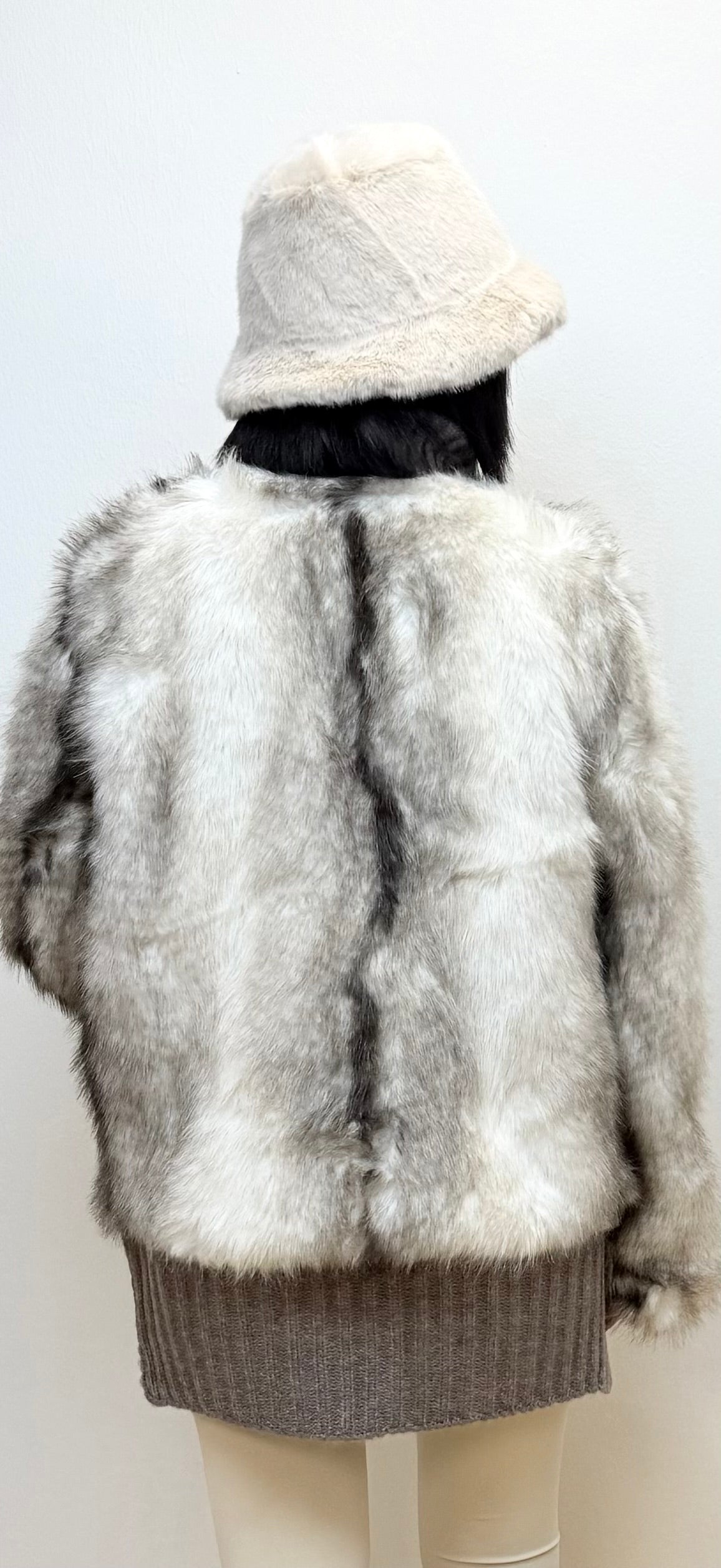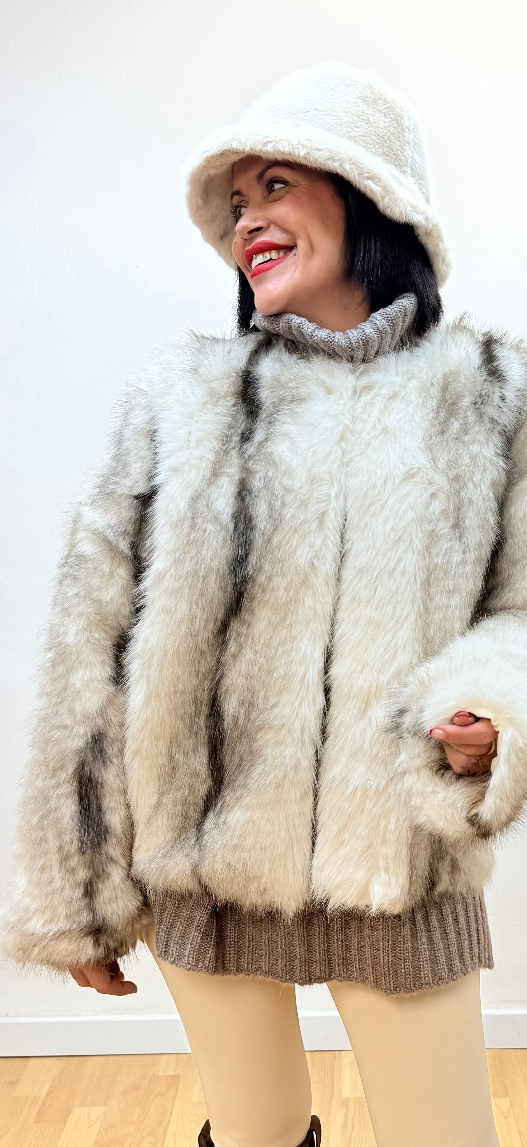 Un abrigo tendencia de pelo combinado en color negro y blanco degradado.