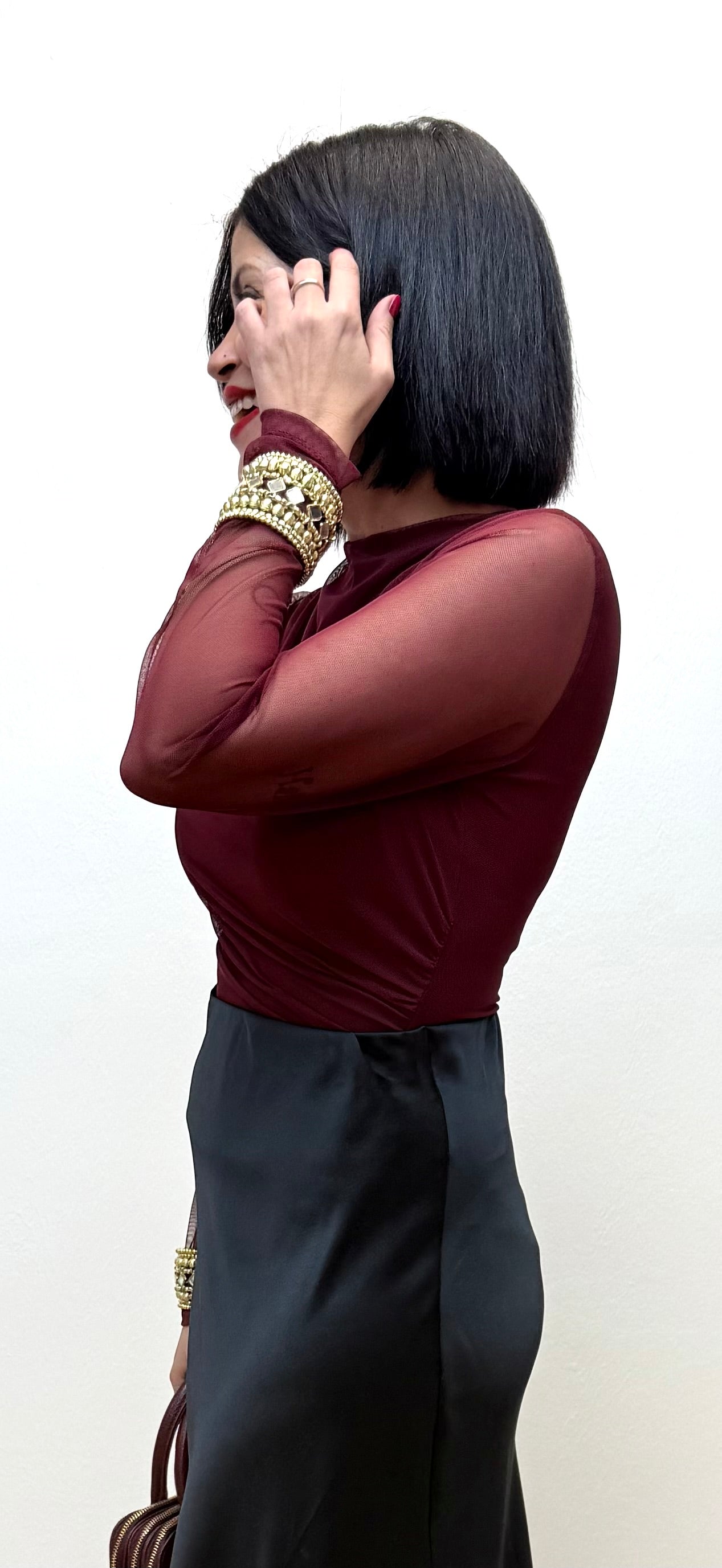Body Burdeos Natacha, con un tejido de lycra y tul combinado que es sumamente bonito, la zona del cuerpo viene doble capa con y ademas con un fruncido que lo hace especial, con mangas semitrasparentes.