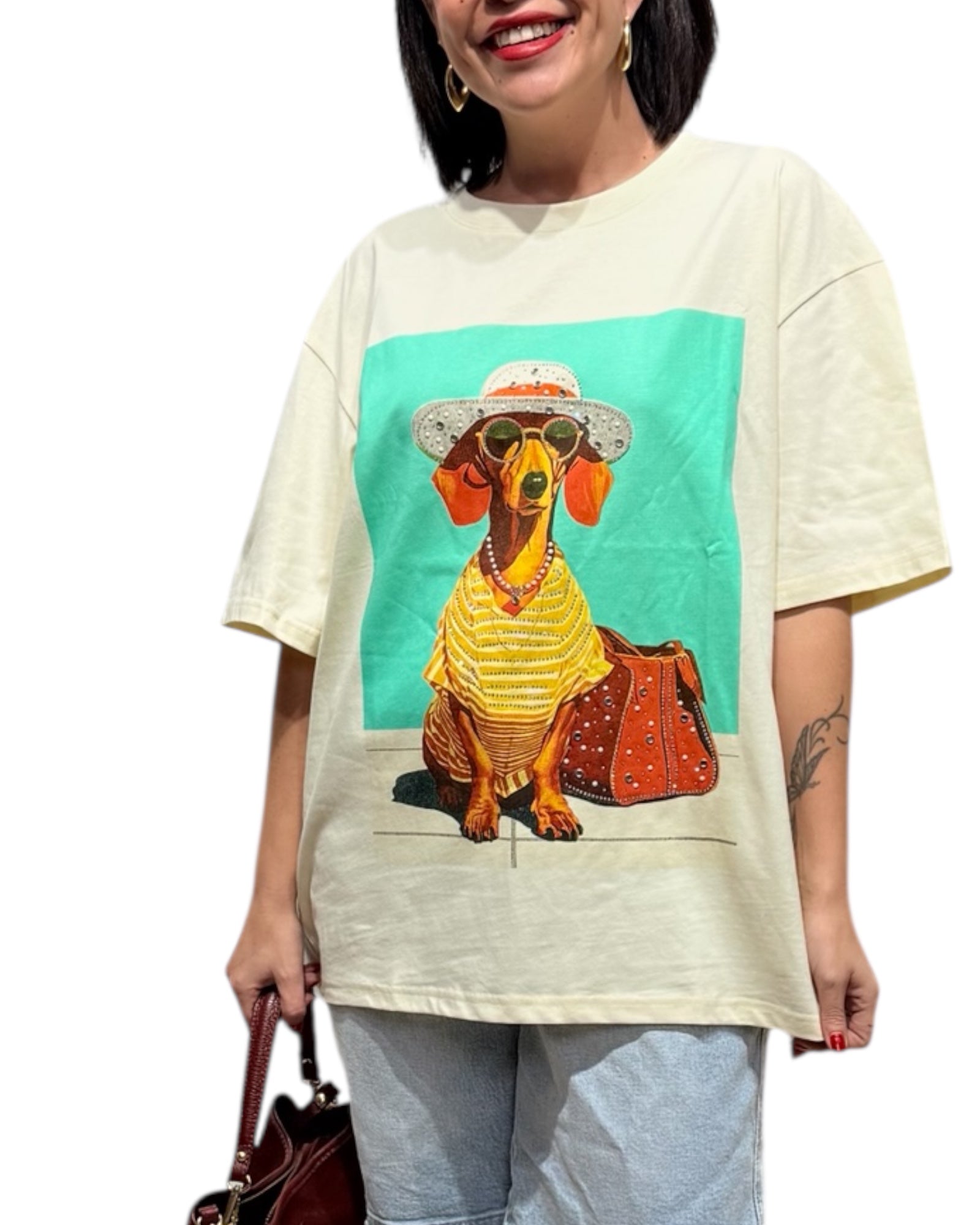 Camiseta oversize, con estampado con detalles de brillos y perlitas.