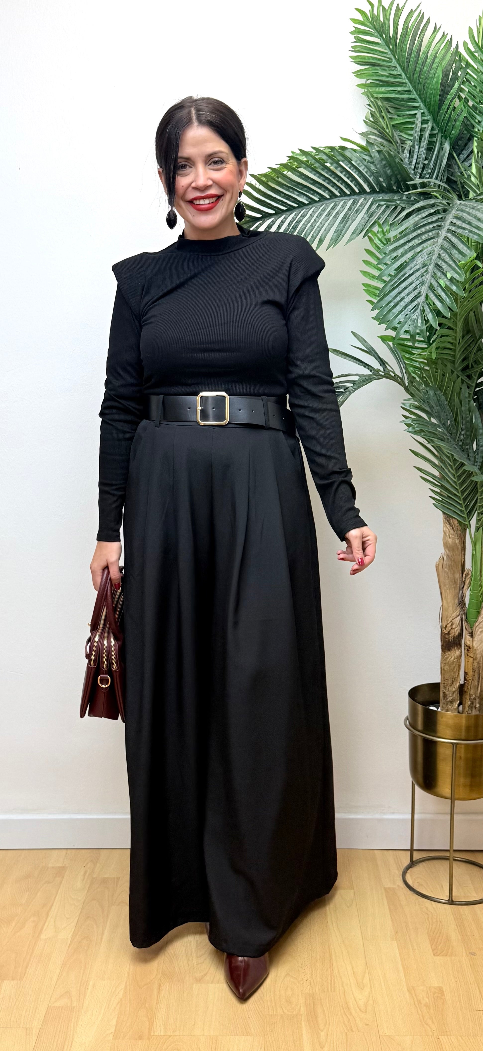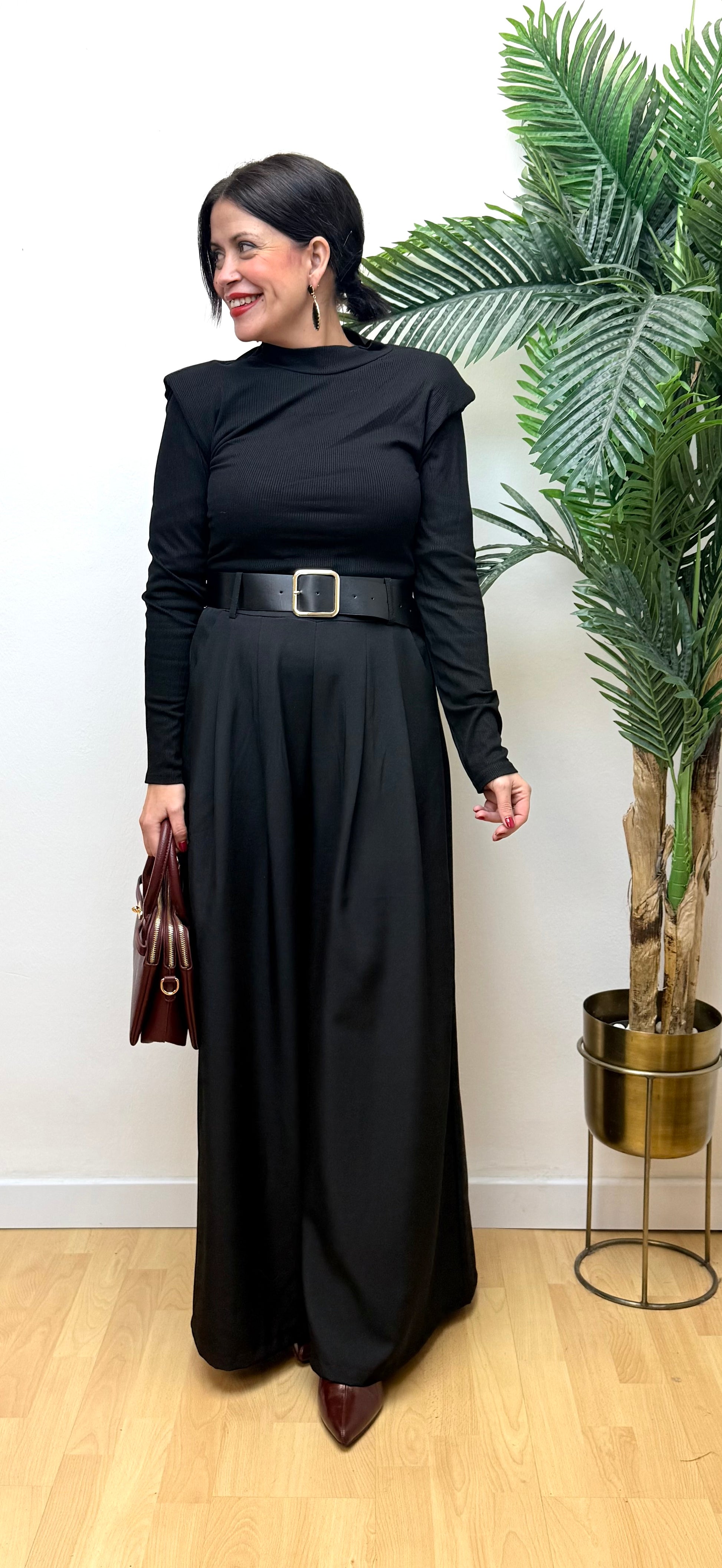 Camiseta hombreras lycra negra Alma, perfecta para combinar con jeans, pantalón de vestir o falda, una pieza clave y versátil que tienes que tener en tu armario.