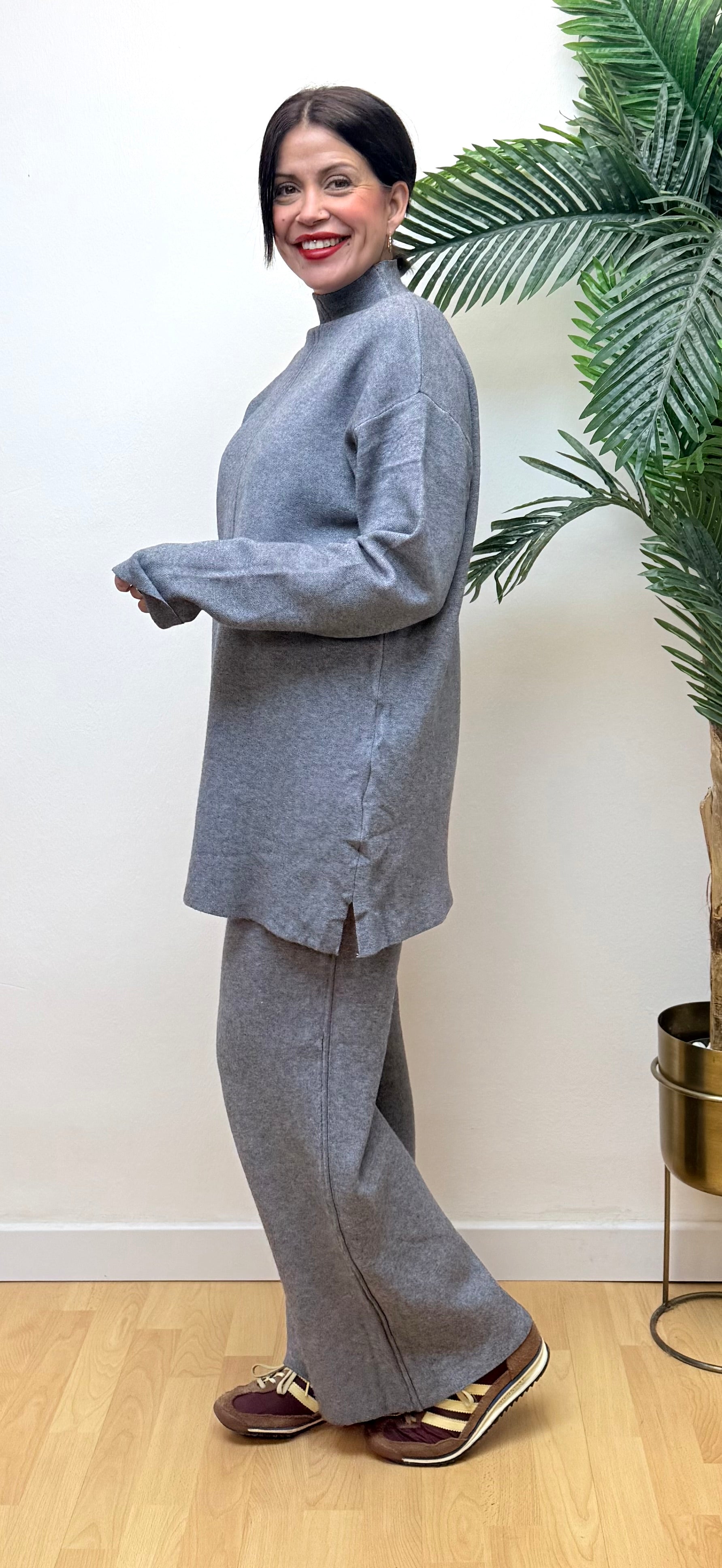 Conjunto Aspen gris, de punto grueso, abrigado, suave.