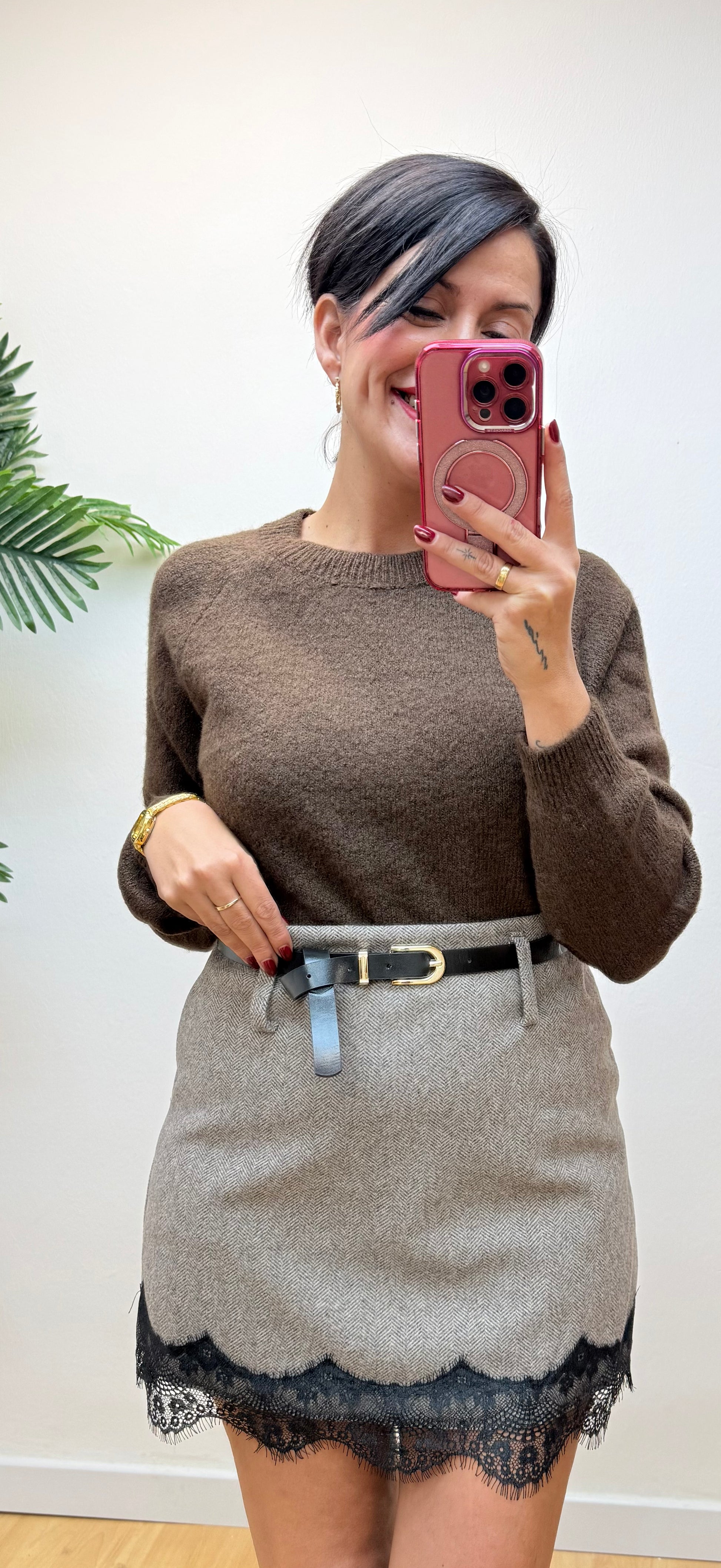 Falda espiga taupé, con un diseño fino con patrón de espiga, combinado con la parte inferior lencero, con corte recto, viene con cinturón incluido