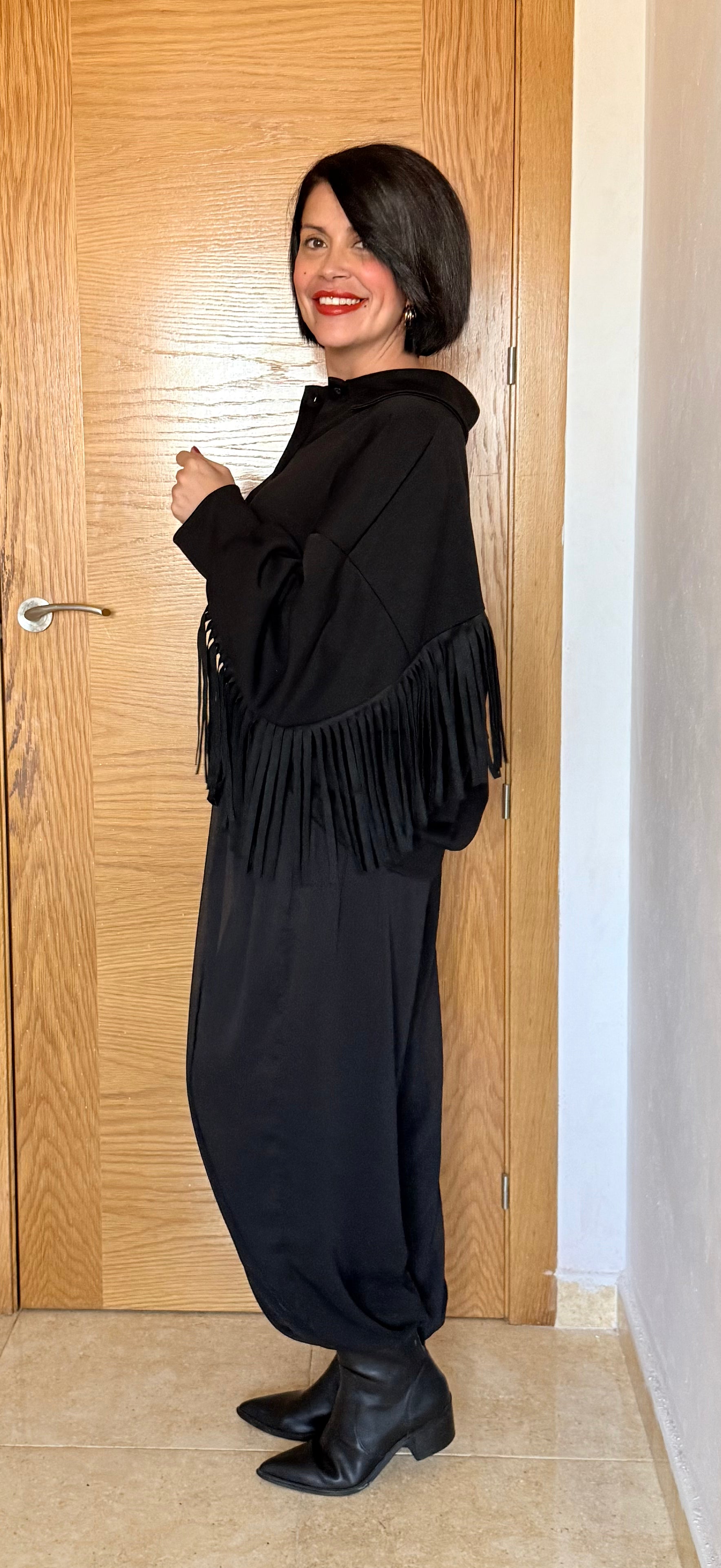 Pantalón Ballon Semi negro, semitransparente con forro interior, es cómodo, amplio, con gomita en la cintura.