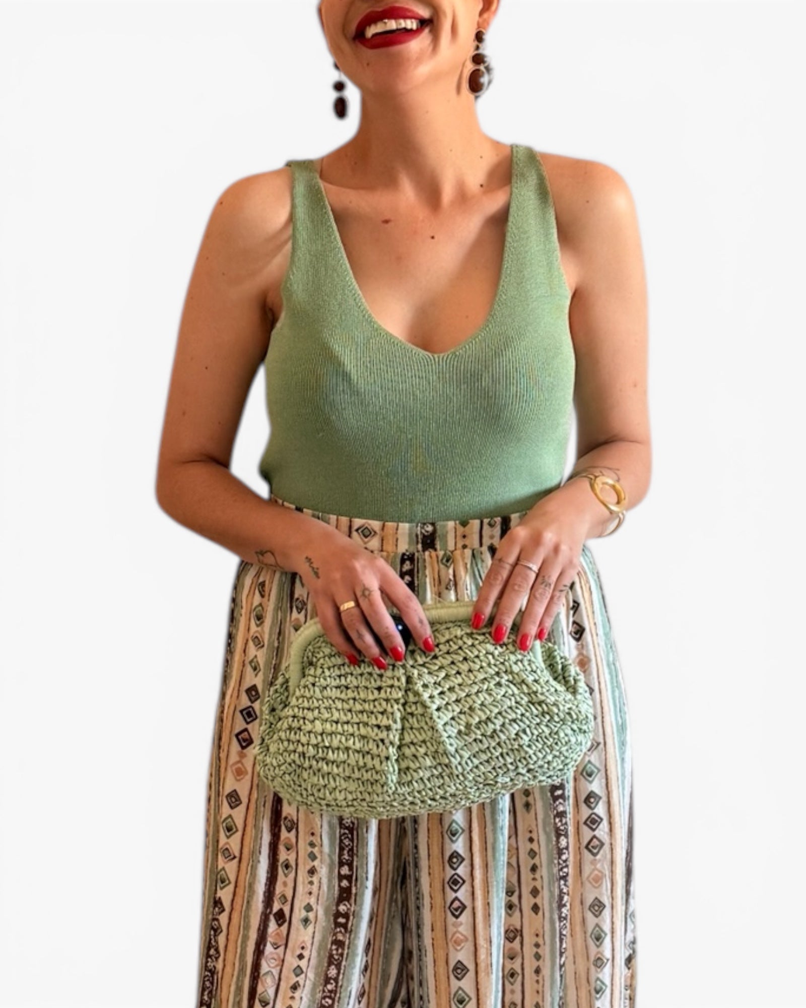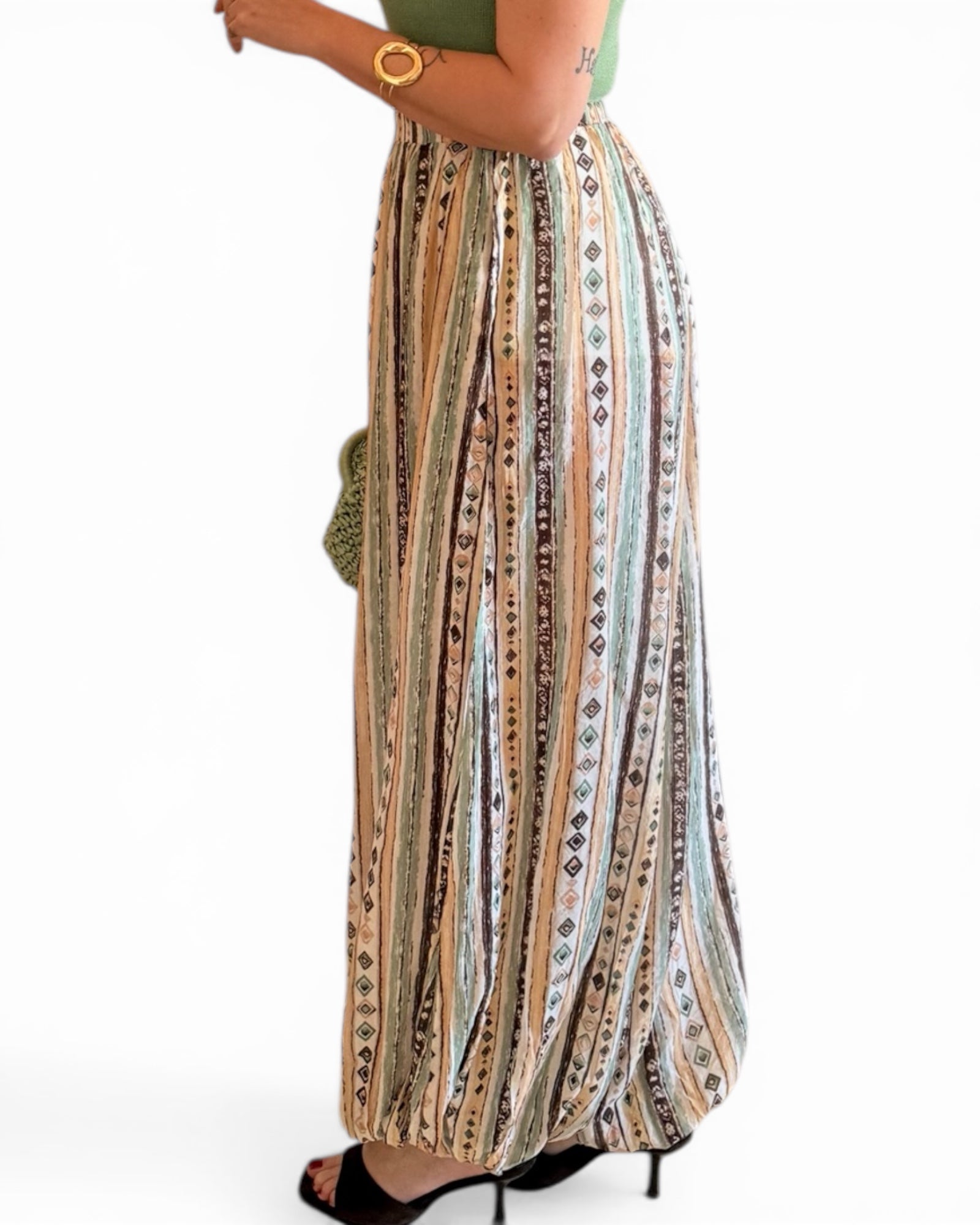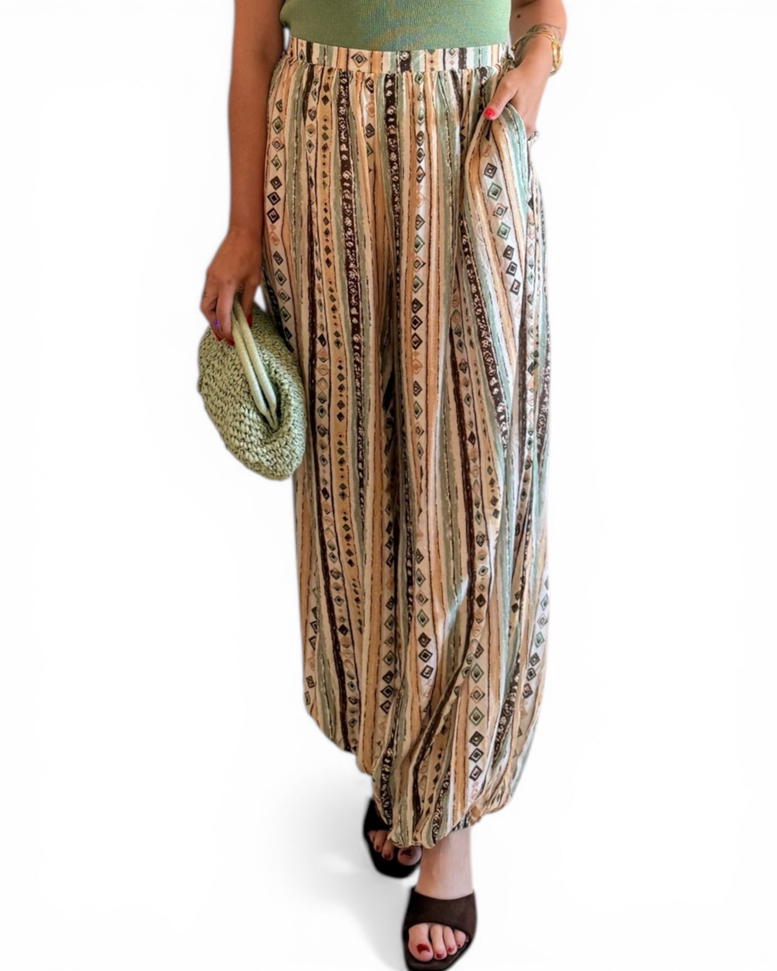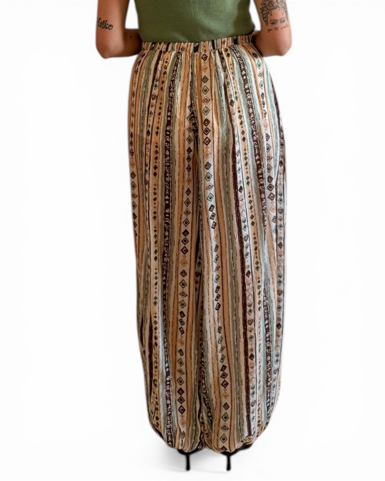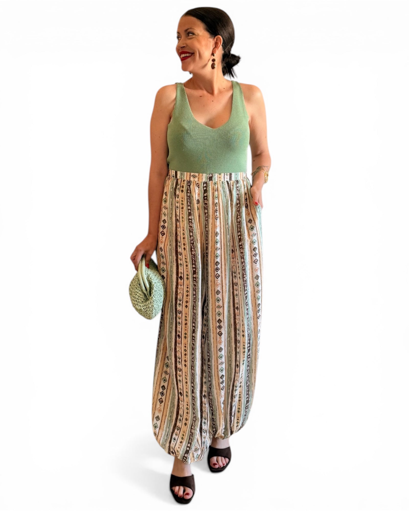 Un pantalón bombacho semi transparente con forro en la zona superior,bolsillos fresquitos, cómodos y con estilo.