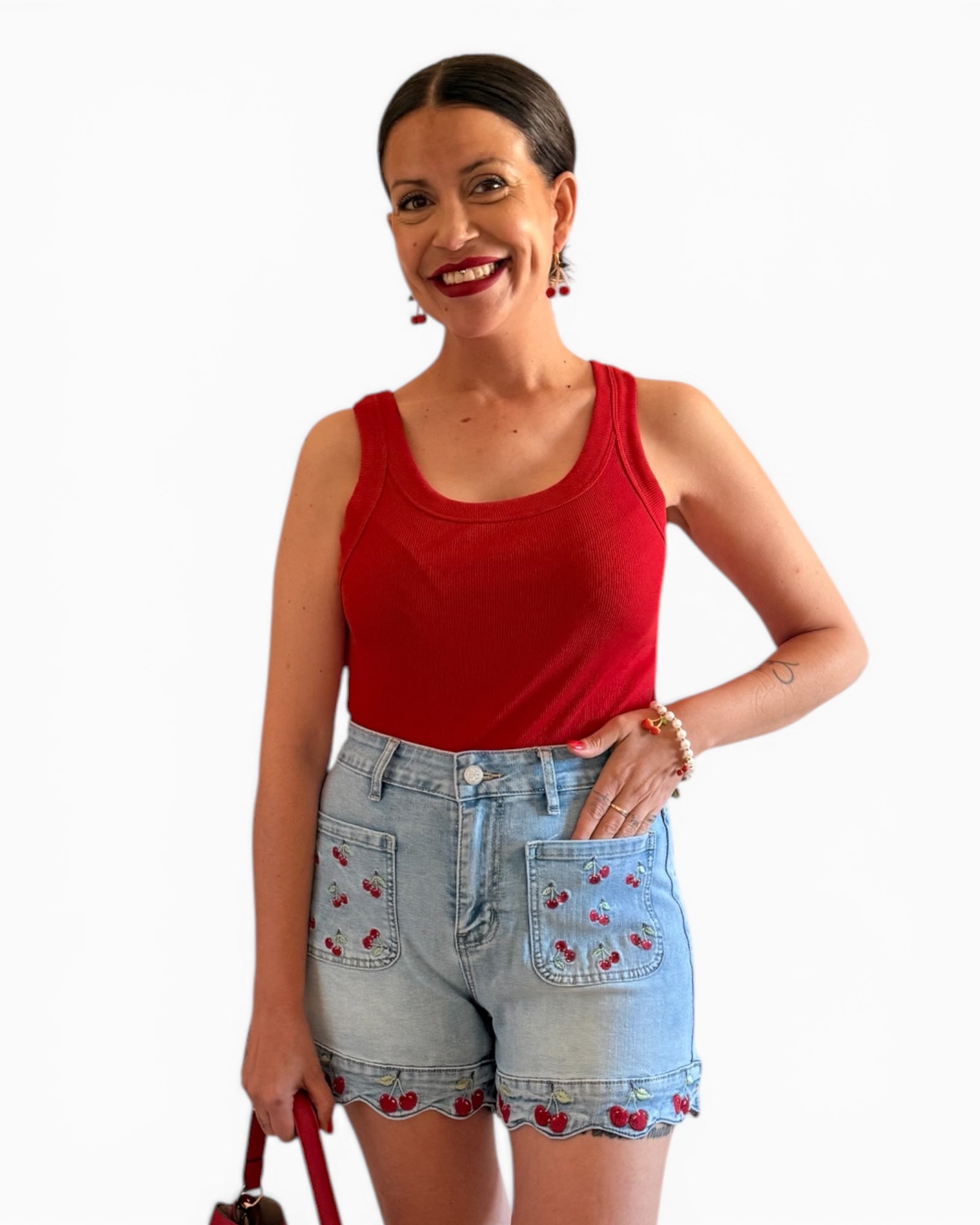 Un short denim con bordado de cerezas, 5 bolsillos ,la parte trasera con onditas.